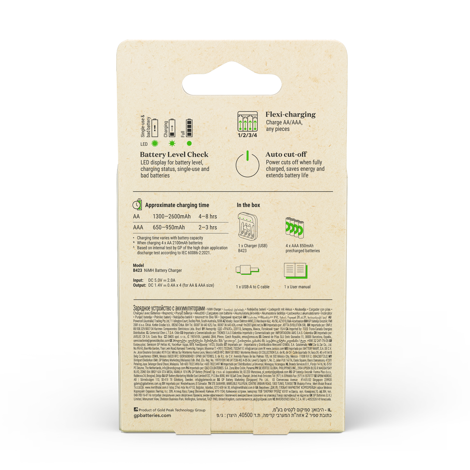B423 laddar fyra AA/AAA-batterier på 6 timmar med USB-C. Du kan se laddprocessen via LED-dioderna som visar laddstatus samt om några engångs- eller dåliga batterier har satts in i laddaren. En annan säkerhetsfunktion är -dV-fullladdningövervakningen som stänger av laddaren när batterierna är fulladdade. Detta förhindrar överladdning, överström och kortslutning, samt förbättrar batteriernas livslängd. Med fyra laddningsbara 850mAh AAA-batterier inkluderade så är allt klart för att sätta igång med denna optimala laddlösning.